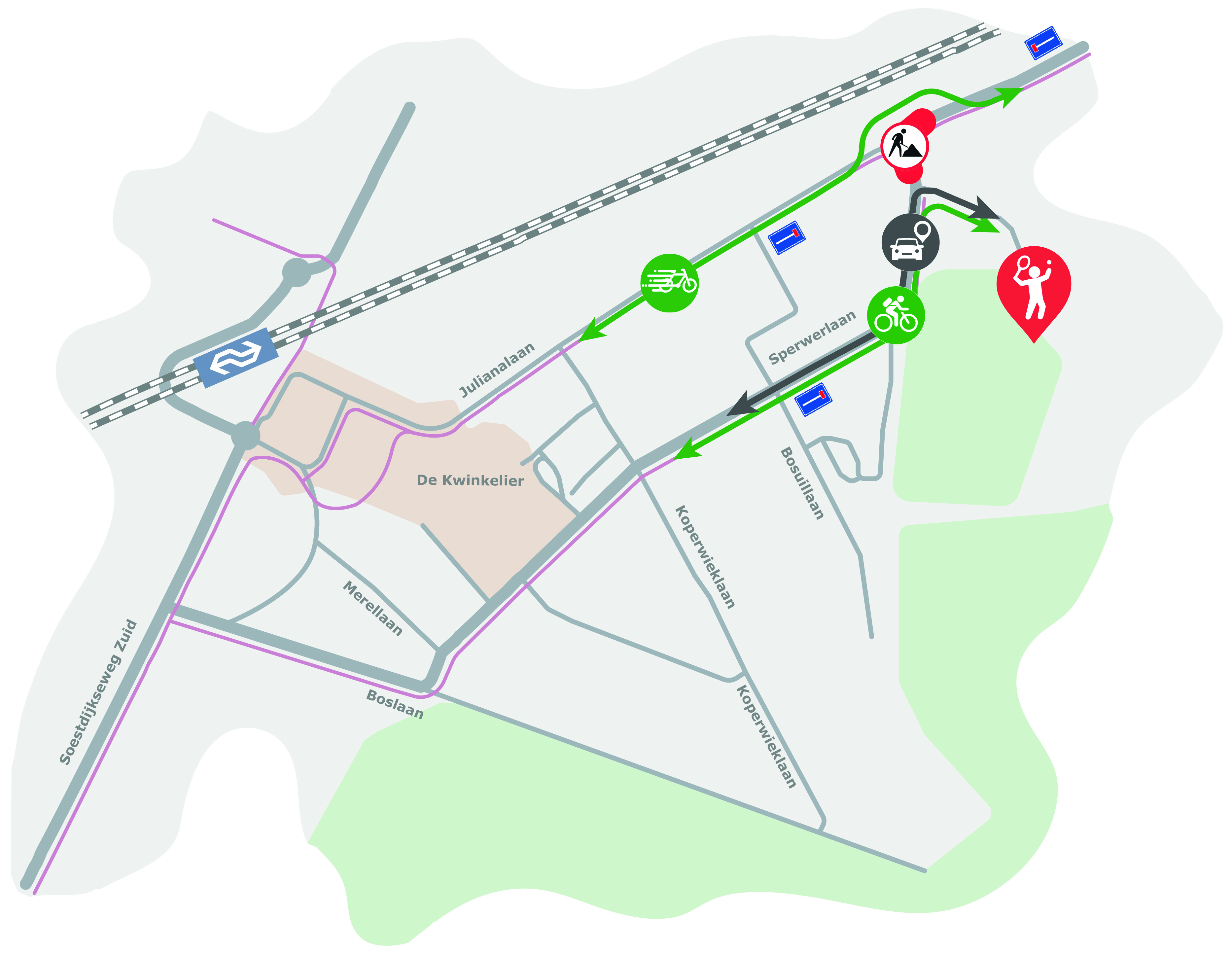 Op maandag 2 maart wordt de nieuwe Sperwerlaan tussen de Burgemeester van der Borchlaan en de Bosuillaan opengesteld voor het verkeer. Dit geeft de ruimte om het laatste deel van de Sperwerlaan en de kruising Julianalaan af te sluiten en toch de toegang tot Bospark, flats, golfbaan en tennispark open te houden. Vanaf dat moment is de club dus alleen bereikbaar vanaf de nieuwe Sperwerlaan, dit geldt niet alleen voor auto- en fietsverkeer maar ook voor voetgangers. Door de afsluiting van de Julianalaan is het ook niet meer mogelijk om vanaf Den Dolder naar de club toe te rijden met de auto, je moet omrijden via Zeist of via Bilthoven Noord. Fietsers kunnen wel langs de werkzaamheden op de Julianalaan rijden. Zie tekening.